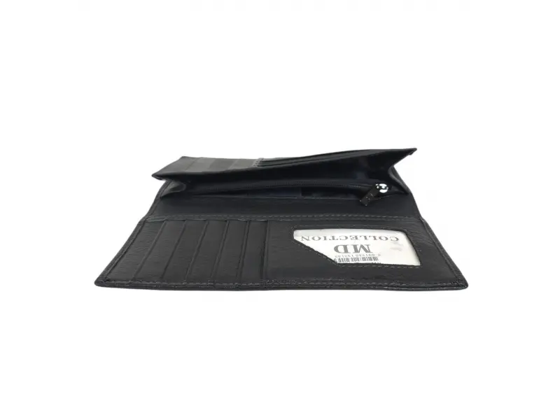 Той разполага с отделения за банкноти, карти и лични документи, както и с джоб с цип.