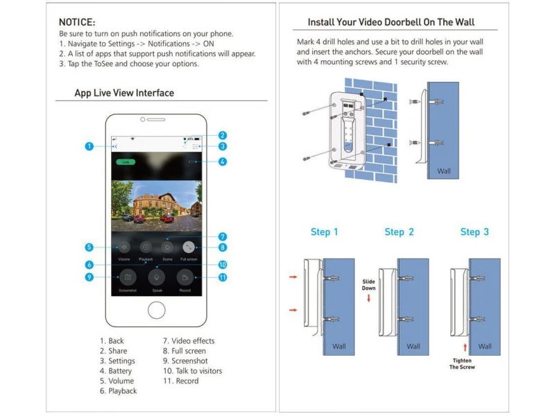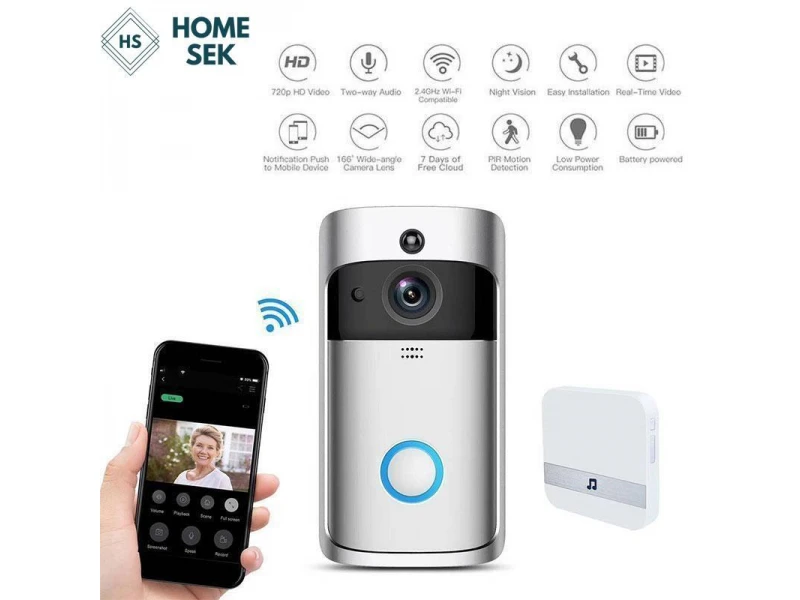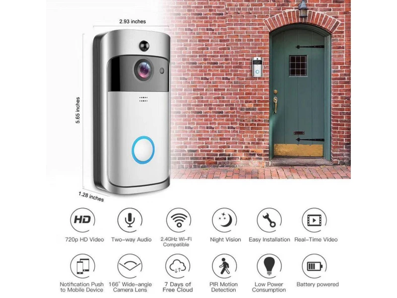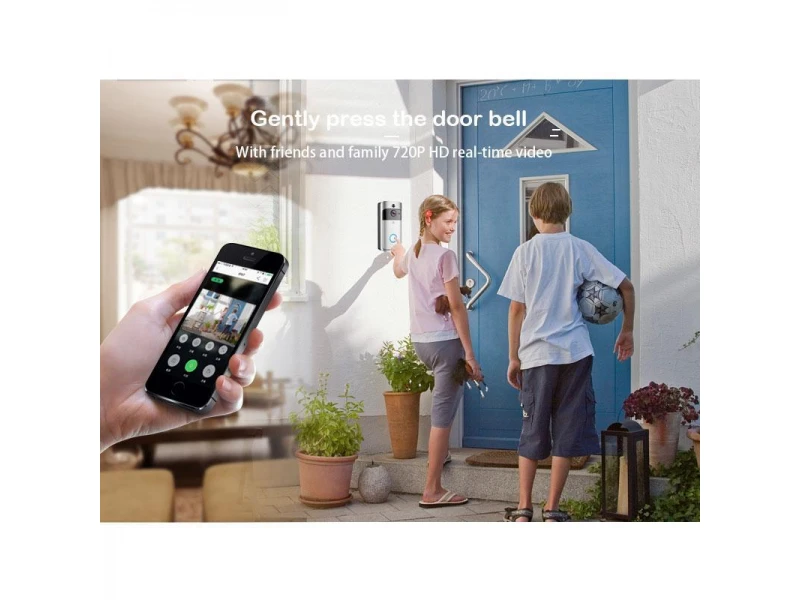С включен PIR датчик за движение: когато някой се движи около вратата, звънецът незабавно ви предупреждава с известие на мобилния ви телефон Висококачествен двупосочен разговор с външния човек, с функция шумопотискане Видео звънецът разполага с три акумулаторни батерии със спецификация 18650. Те се зареждат с USB кабел, който може да включите в контакта Над милион HD пиксели съчетани с широкоъгълен обектив от 166 градуса. Поддържа функция за бързо събуждане на мобилния телефон в рамките на 1 секунда. 2.4G Wi-Fi връзка Дневен и нощен режим с автоматично превключване, независимо дали e ден или нощ, изображението е ясно видимо, за вашата безопасност и семейна сигурност Монтаж: Монтиране на стена Размер на сензора (инч): 1/4 инча Звънец: Да Метод на свързване: Безжичен Водоустойчивост: Да Вид на щепсела: ЕС щепсел Детектор за движение: Да Модел: WiFi видео звънец с камера и интерком връзка със смартфон Мощност: Консумация на енергия в режим на готовност 400uA Технология: Цифрова Материал: ABS Интерфейс за IP камера: Не Комуникационен интерфейс: Безжичен Тип камера: CMOS Размери: 144 * 74 * 32 мм (5.6 * 2.9 * 1.3 инча) Ъгъл на видимост (°): 160 градуса Резолюция: 720P Мощност: 18-24V AC захранване. Захранване: 3 броя батерии със спецификация 18650 (Включени в комплекта!). Активиране: Натискане на бутона / Чрез PIR датчика за движение/ Чрез мобилното приложение