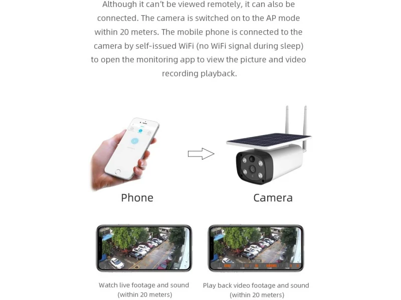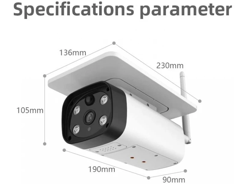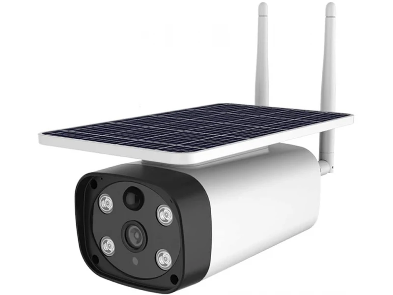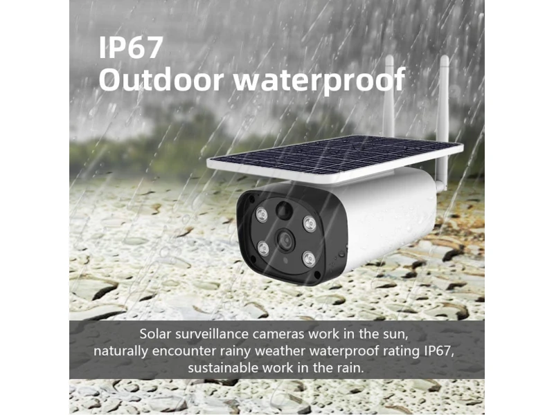 Соларна безжична камера WiFi IP 2MPX камера 1080P Full HD с PIR сензор за движение с вграден микрофон, слот за SD карта до 64GB и говорител за двупосочна аудио връзка. Камерата разполага с 2бр. бели светодиоди 2W LED 1W*2 и 2 бр. IR светодиода 2W LED 1W*2 за нощно видеонаблюдение до 60 метра. Изключително ниска консумация на енергия и интелигентна функция за пестене на енергия. Устройството разполага с два режима на работа – стендбай с консумация 0.0076W и в работен режим през деня – 1.4W, през нощта – 2.4W. Поддържа 4 акумулаторни батерии тип 18650, които се зареждат чрез соларния пален или с USB кабел. Отдалечено наблюдение в реално време, преглед на записите и администрация през Android и iOS устройства. Стойка за лесен монтаж на таван или стена. Влагозащитен корпус с елегантен дизайн – IP67.