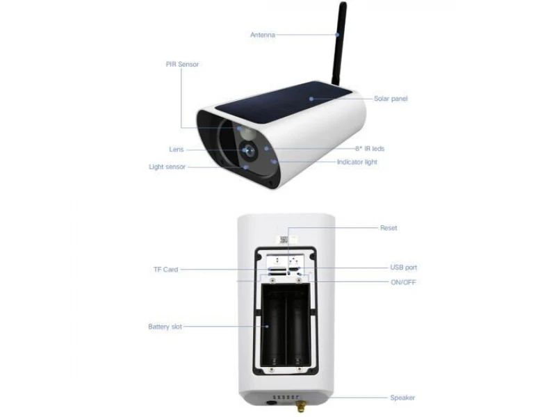 Иновация във видеонаблюдението ! Без сложни системи и захранващи кабели! Изключително лесен монтаж без никакви познания! Поставете навсякъде, без ограничения! Свързване само и единствено с Wifi! Супер Водоустойчива! Нашата смарт соларна камера Solar PRO Full HD е подходяща за външно наблюдение на жилищни и търговски сгради, къщи, вили, къщи за гости, апартаменти, пчелини, язовири, паркинги и още много, навсякъде където има достъп до светлина. Достъпна 24/7 онлайн през вашия смартфона или компютър. Топ 6 предимства на охранителните соларни камери. 1. Соларните камери за сигурност позволяват поставянето им на трудностъпни места. 2. Лесен за инсталиране и преместване, без нужда от кабели. 3. Екологично чисти. Използват само слънчева енергия. 4. Соларните камери предлагат наблюдение през деня и нощта 24/7. 5. Двупосочно аудио връзка. 6. Камерите и батериите в тях имат дълъг експлоатационен живот. ОПИСАНИЕ: Може да се използва навсякъде и по всяко време! Включени в комплекта литиеви батерии, с голям капацитет и соларен панел; Wifi връзка и дистанционно управление, чрез мобилното приложение; Може да се използва навсякъде и по всяко време! По-високо качество на изображението благодарение на Full HD 3-мегапикселова реална резолюция, 4X Zoom, нощен изглед, сензор за запис и движение до 50 метра. ХАРАКТЕРИСТИКИ: – Здрав пвц корпус– Водоустойчив IP67– Без кабели, безжичен– Вграден соларен панел за презареждане на батерията– Батерии с голям капацитет!– Нощно виждане , IR 8 светодиоди– FullHD 1080p 1920×1080 резолюция– 3.6мм, 2MP, HD обектив– Зрително поле с ширина 100 градуса– Слот за MicroSD карта до 64 GB (*не е включена в комплекта)– IR-CUT за ясно изображение– Детектор на движение– Android / iOS съвместим– Размер L200mm x W100mm x H70mm– Тегло на пакета 1000гр