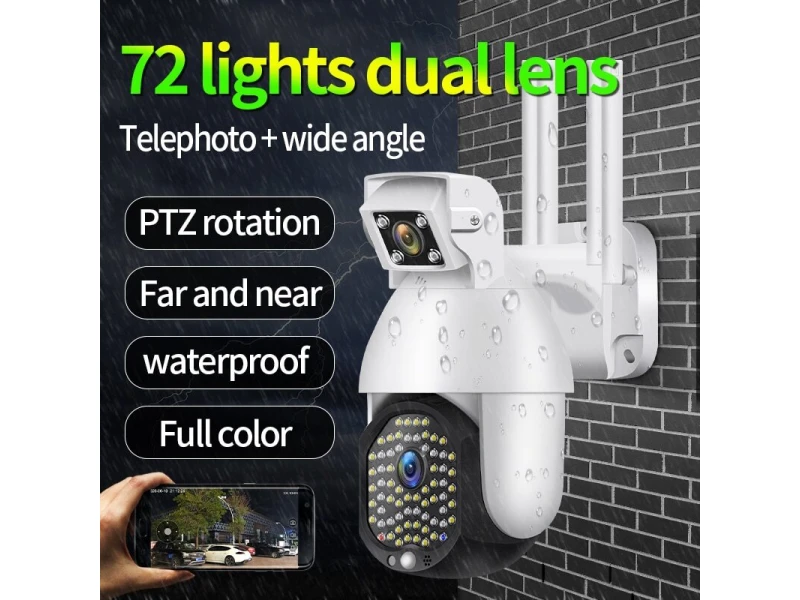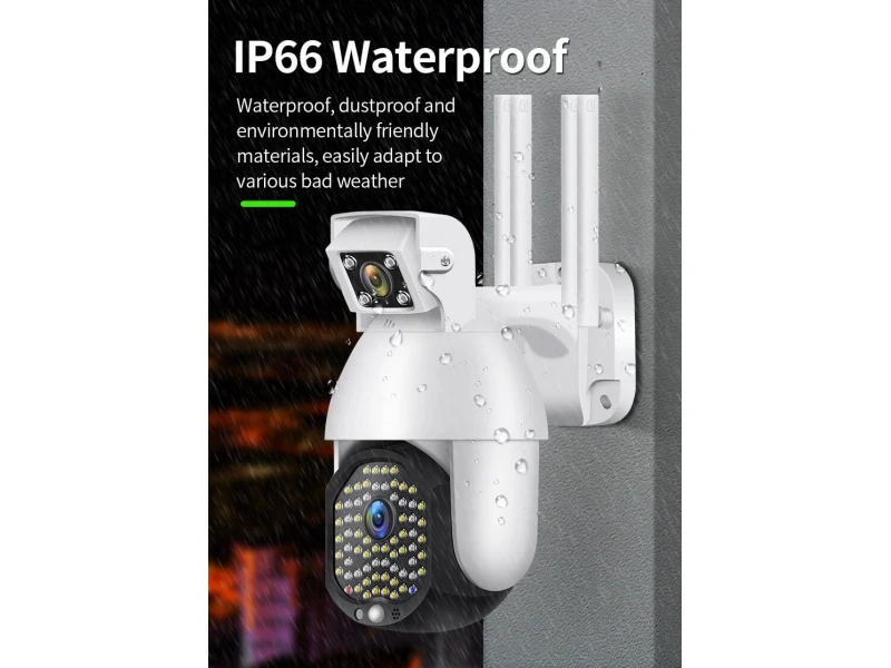 Външна Водоустойчива Камера Wifi Full HD 2.0MP 50 LED 355° автоматично въртяща се с 2 подвижни лещи от ново поколение! ЦВЕТНО НОЩНО ВИЖДАНЕ! Широкообхватна! Перфектно качество и на нощен запис! До 8 пъти ZOOM! IP66 влаго и водоустойчивост! Inteligent tracking за автоматично завъртане и следене на обекти. Лесно и бързо свързване с телефон! Гаранция 24м.! ХАРАКТЕРИСТИКИ: Камерата притежава функцията Motion Tracking + Inteligent tracking (автономно завъртане и следене на обекта), а не само моушън детекшън ( нотификации при движение в обсега на камерата). Камерата използва приложението Icam 365 Чисто нови въртящи (PTZ) на 320° градуса по хоризонтала и 90° градуса по вертикала се безжични WIFI IP Full HD камери със резолюция 1920х1080 FULLHD, 2.0MP Lend , 3.6mm фокусПрахо-влагоустойчиви, покриват стандарт IP66 могат да бъдат поставени на открито. Снабдени с 50 ДИОДА, които могат да покрият до 30 метра видимост през тъмната част от денонощието. Интегриран слот за поставянето на микро карта (microsd) до 128гб капацитет, за запис на видео и/или снимки. Опция за свързване към WiFi рутер и гледане дистанционно посредством мобилни данни или WiFi връзка на телефона. Вграден сензор за движение при, който камерата може да записва единствено и само когато има движение пред нея. В камерата е монтиран микрофон и високоговорител, така че да слушате какво се случва около камерата, а посредством високоговорителя можете от телефона да говорите и да се възпроизвежда от камерата.Спецификация:- Видео резолюция 1920х1080 fullhd, Lens, 2.0MP Image 3.6mm фокус- Сензор - HI3518E+SC2235 15fps- Свързаност - безжично през WiFi 2.4g b,g,n до 50 метра в зависимост от сградите, жично през LAN/UTP/ кабел.- Подръжка на ONVIF протокол /камерата може да бъде звързана към мрежов видео рекордер NVR.Софтуер:- Бърза и лесна настройка в рамките на 5 мин. Приложенията разполагат с богата гама от различна конфигурация на камерите.- Сензор за движение - 3 типа чувствителност /ниска, средна, висока/. Известяване на телефона при наличието на движение. -Дистанционно гледане на записаните видео клипове или снимки от картата памет през приложението.- Качество на записваните видео клипове: 6 степени.- Време на записване при движение - от 5 до 120 мин + запис на звук, презапис при запълване на картата памет- Скорост на въртене на камерата - слабо, нормално, бързо.- Камерите предоставят достъп през WEB интерфейс по IP адреса, който взема.Комплекта включва: PTZ /въртяща камера/, захранващ адаптер 12v, 2a * Гаранция: 24 месеца