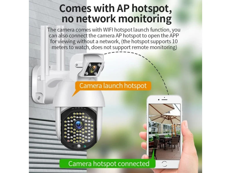 Външна Водоустойчива Камера Wifi Full HD 2.0MP 50 LED 355° автоматично въртяща се с 2 подвижни лещи от ново поколение! ЦВЕТНО НОЩНО ВИЖДАНЕ! Широкообхватна! Перфектно качество и на нощен запис! До 8 пъти ZOOM! IP66 влаго и водоустойчивост! Inteligent tracking за автоматично завъртане и следене на обекти. Лесно и бързо свързване с телефон! Гаранция 24м.!