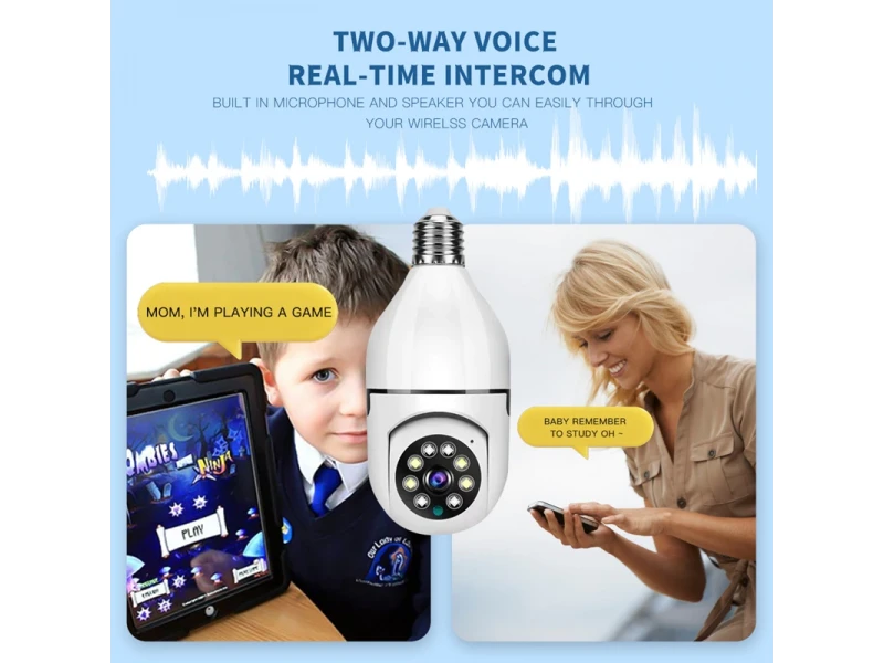 Иновативна Куполна камера тип крушка с ъгъл на видимост 360° и вграден микрофон е идеален продукт за скрито видеонаблюдение,наблюдение на дома,офиса или търговски обекти.Куполна камера тип крушка работи в дневен и нощен режим, което я прави незаменим помощник за контрол.Работи с мобилно приложение YI IoT подходящо за iPhone и Android.Куполна камера тип крушка е изключително лесна за монтаж.Разполага с висококачествен вграден микрофон и говорител за двупосочна аудио връзка.Характеристики:Пиксели: 2MP;Резолюция: 1920х1080р;PTZ Функция (движение);Wi-Fi камера (без нужда от окабеляване);Двупосочен звук ( позволява да говорите и слушате ясно през телефона си);Аларма (опция за сигнал при движение);Известия за движение ( на мобилно устройство или настолен компютър);Нощен и дневен режим на работа;Цветно нощно виждане;IR + White + LEDs диоди;Прахо- и влагоустойчива;Съхранение в облак;Приложение: YI IoT;Захранващ интерфейс: Е27;Захранващо напрежение: 220v-240v ACКомплектът включва:1 х камера;1х фасунга Е27;1 х ръководство за потребителя на БЪЛГАРСКИ ЕЗИК1 х крепежни елементи.