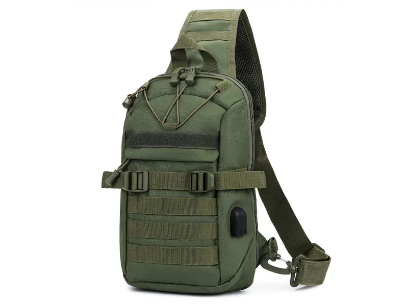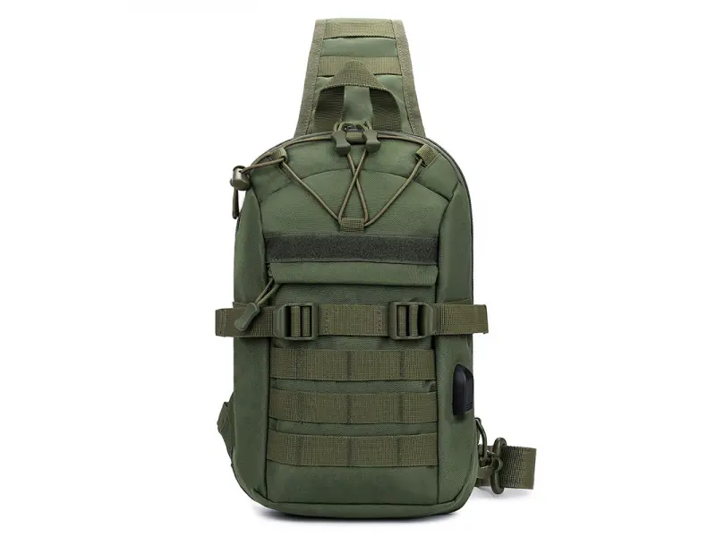 Удобна мъжка чанта - Мъжка чанта, която може да се носи през гърди, рамо или гръб тип раница. - Едно основно отделение с цип. - Малък вътрешен джоб без цип. - Кабел и букса за USB. - Преден джоб с цип. - Заден джоб. - Регулираща се презрамка. - Възможност за смяна на посоката на носене.