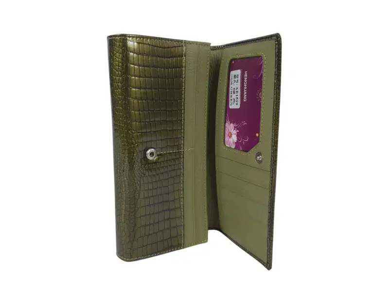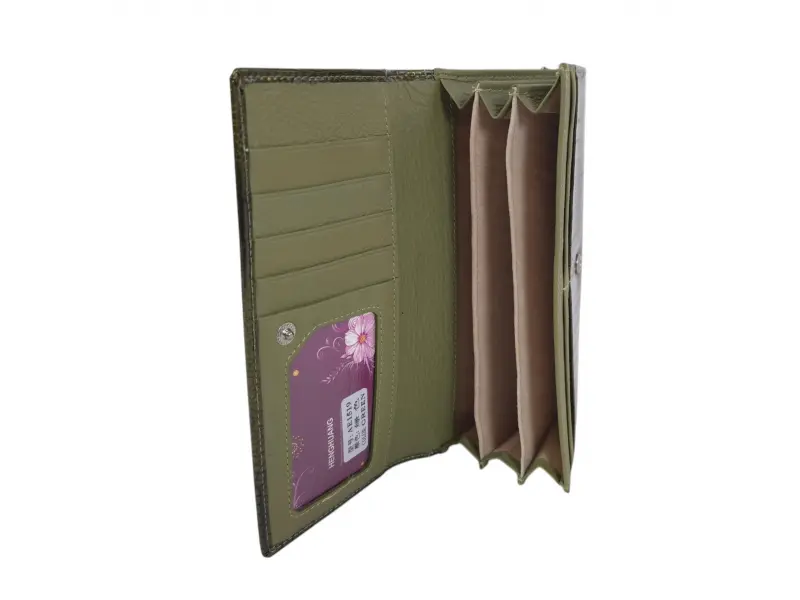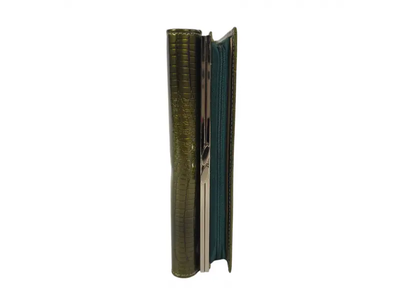 Зелено дамско портмоне от естествена кожа и лак. Голямо дамско портмоне с отделения за банкноти, слотове за карти и лични документи и монетник с цип. Красиво дамско портмоне с интересен дизайн.