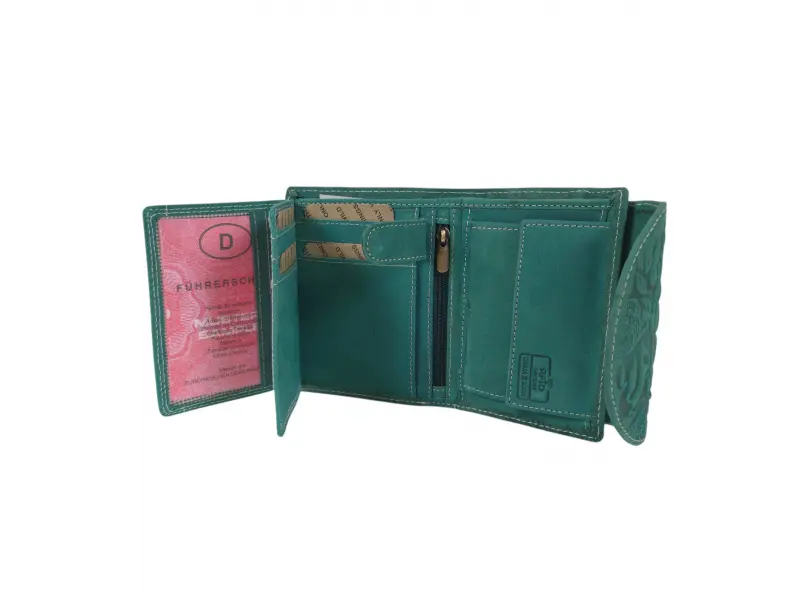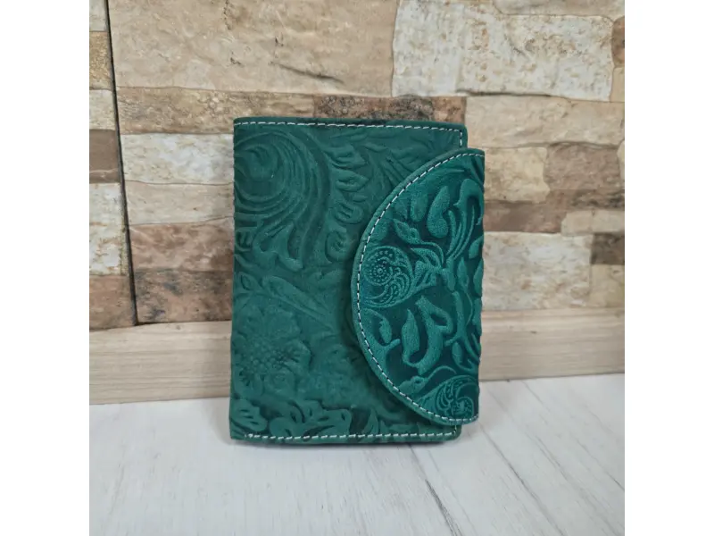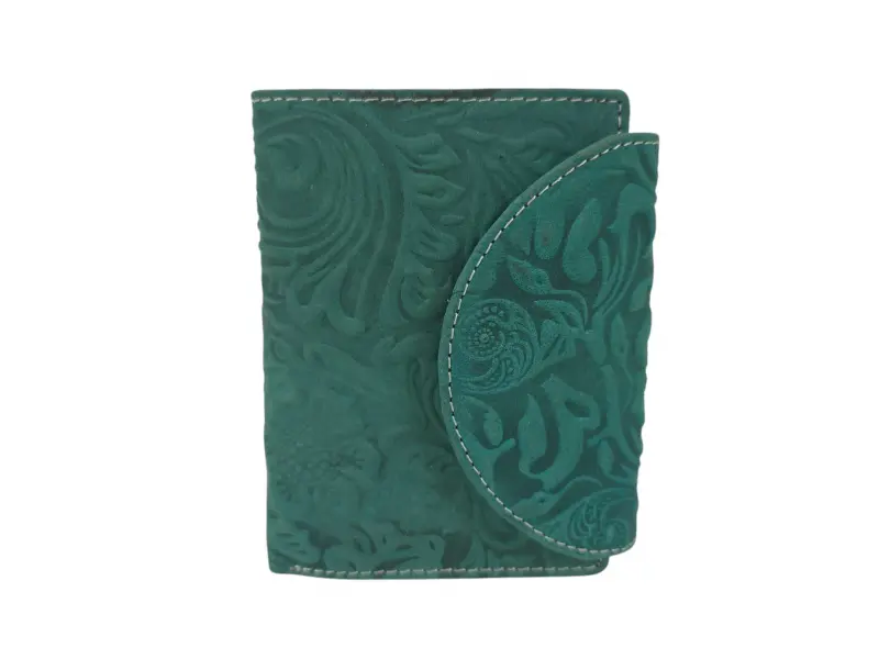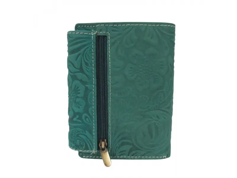Зелено дамско портмоне от Индия - Дамско портмоне от естествена кожа. - Закопчаване с копче тик-так. - Отделения за карти. - Отделения за банкноти. - Вътрешен монетник с копче. - Вътрешен джоб с цип. - Заден джоб с цип.