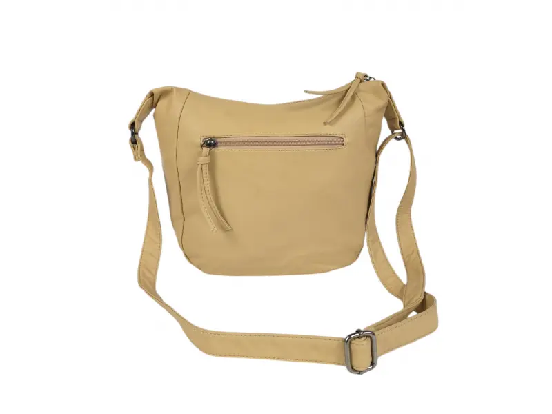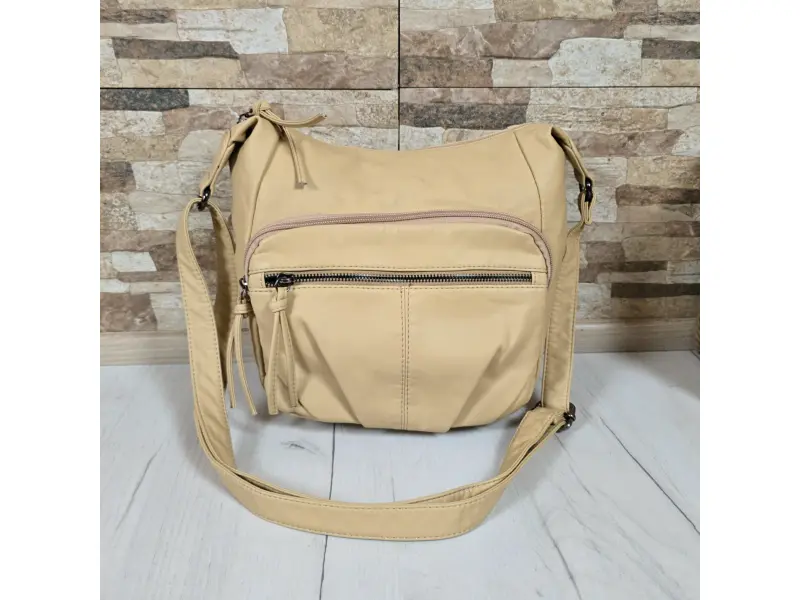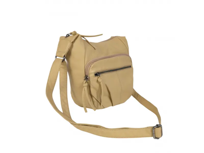 Дамска чанта с интересен дизайн - Дамска чанта от варена кожа. - Едно основно отделение с цип. - Малък вътрешен джоб с цип. - Отделения за телефон и документи. - Два предни джоба с цип. - Заден джоб с цип. -Удобна дълга регулираща се дръжка.
