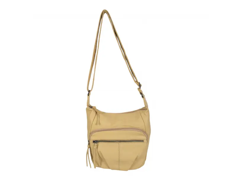 Средна дамска чанта от мека на допир варена кожа. Ежедневна дамска чанта за през рамо с много отделения. Жълта дамска чанта с регулираща се дълга дръжка.