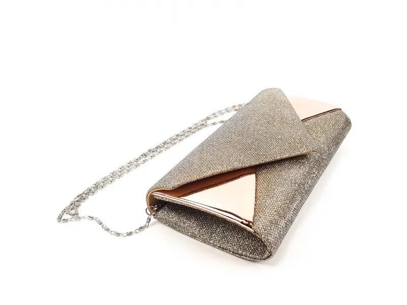 Стилна малка чанта подходяща за абитуриентски бал , официални вечери или просто за вечерна чанта. Златна дамска чанта тип клъч , вечерна с дълга сребриста верижка и едно голямо отделение.