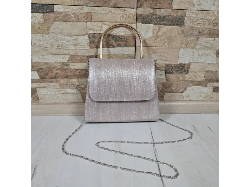 Златна чанта с елегантен дизайн - Официална дамска чанта с едно отделение. - Отваряне и затваряне с магнит. - Дръжка за носене в ръка. - Дълга дръжка тип верижка.