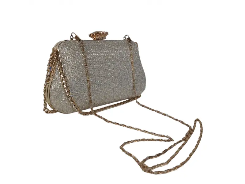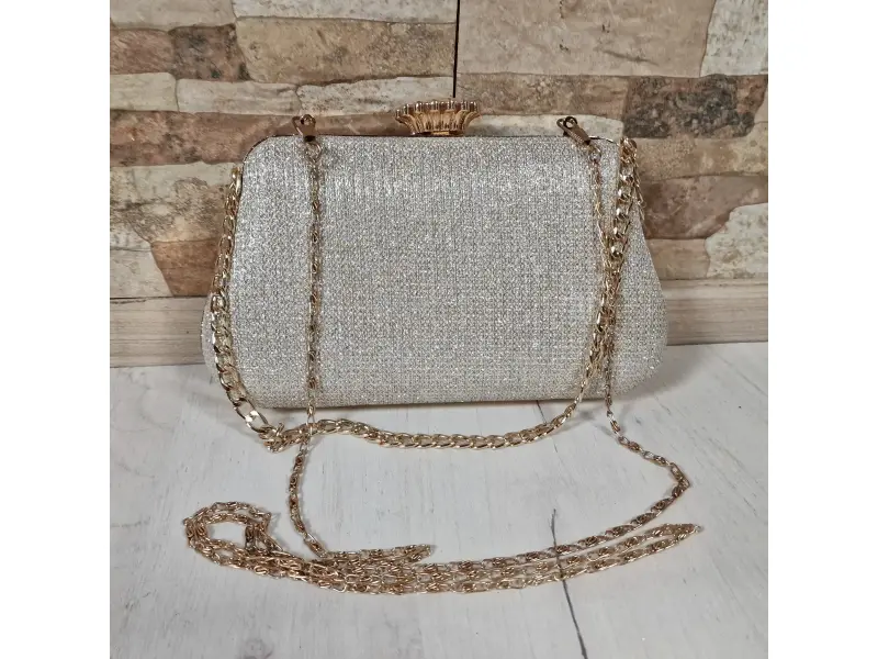 Стилна малка дамска чанта - Официална дамска чанта с едно отделение. - Отваряне и затваряне с механизъм. - Златен кант. - Дръжка за носене в ръка. - Дълга дръжка тип верижка.